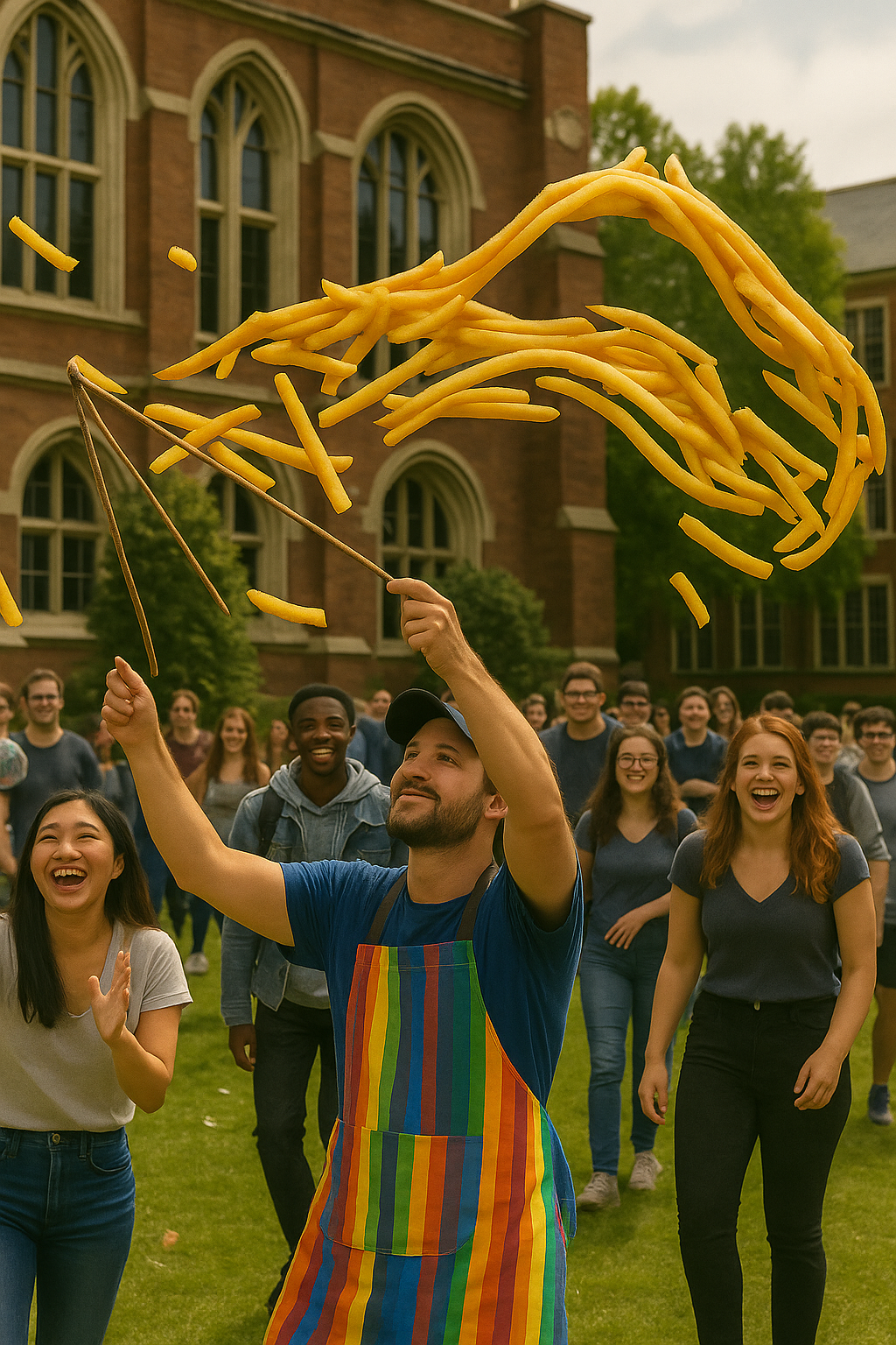 The quad turned into a crispy carnival Monday afternoon when visiting performer “Fry Guy” unveiled his one-of-a-kind French fry artistry. Students gathered in droves as baskets of golden fries were launched, stacked, and sculpted into dazzling displays.